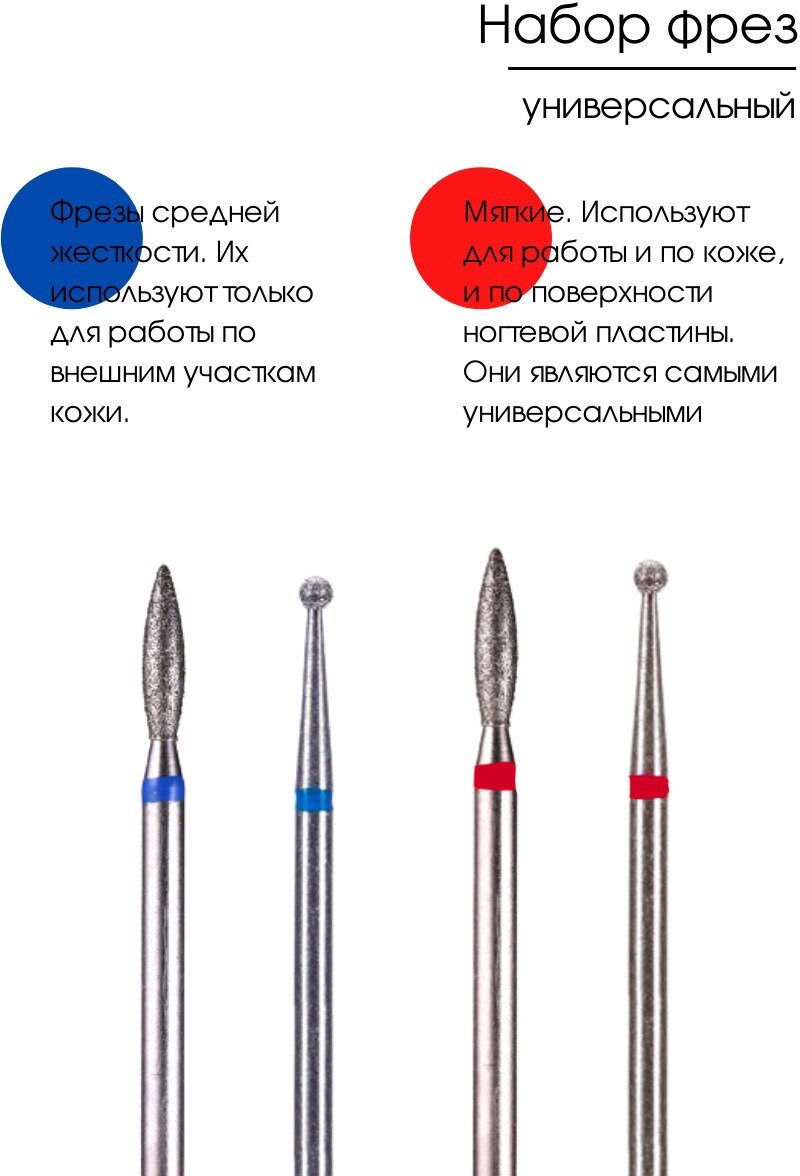 Kaaraanly, Набор фрез алмазных для аппаратного маникюра, педикюра 4 шт. с синей и красной насечкой / пламя / шар интересное: