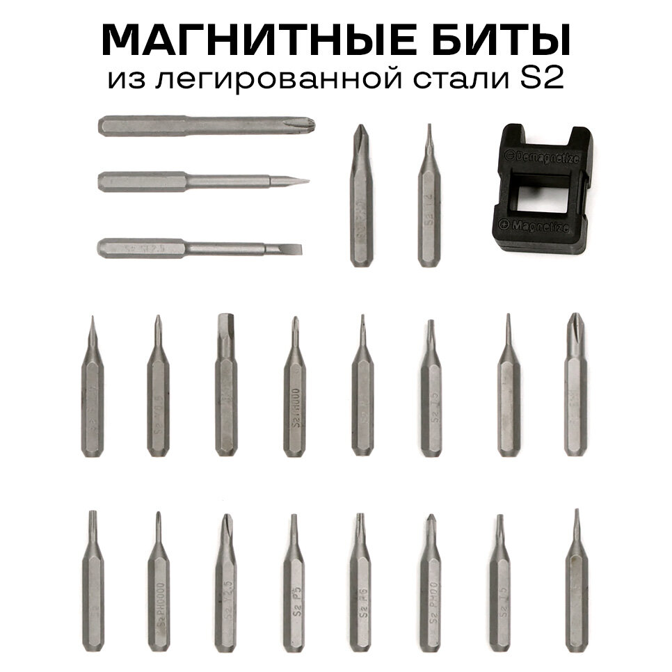 | Комплектация | отвертка, 20 бит, кейс, устройство для намагничивания и размагничивания комплектных бит |