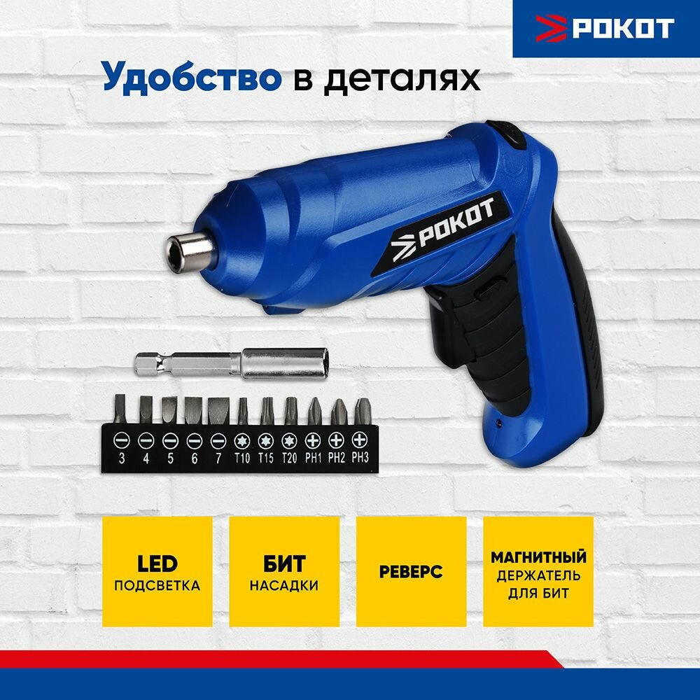 Рокот Отвертка аккум. 3,6 В, 1,3А*ч, Li-on, блистер, держатель магн. д/бит, набор бит 11шт