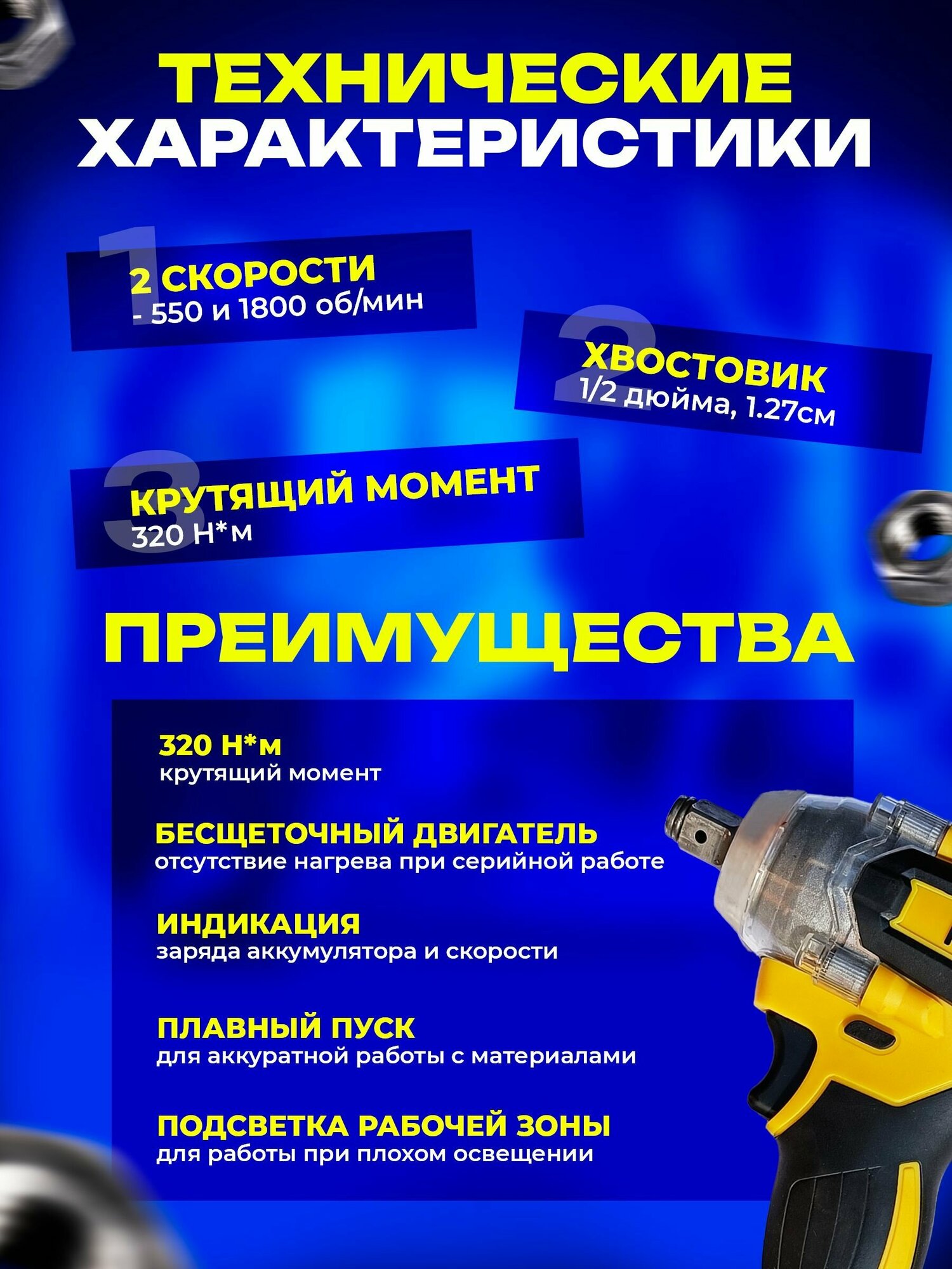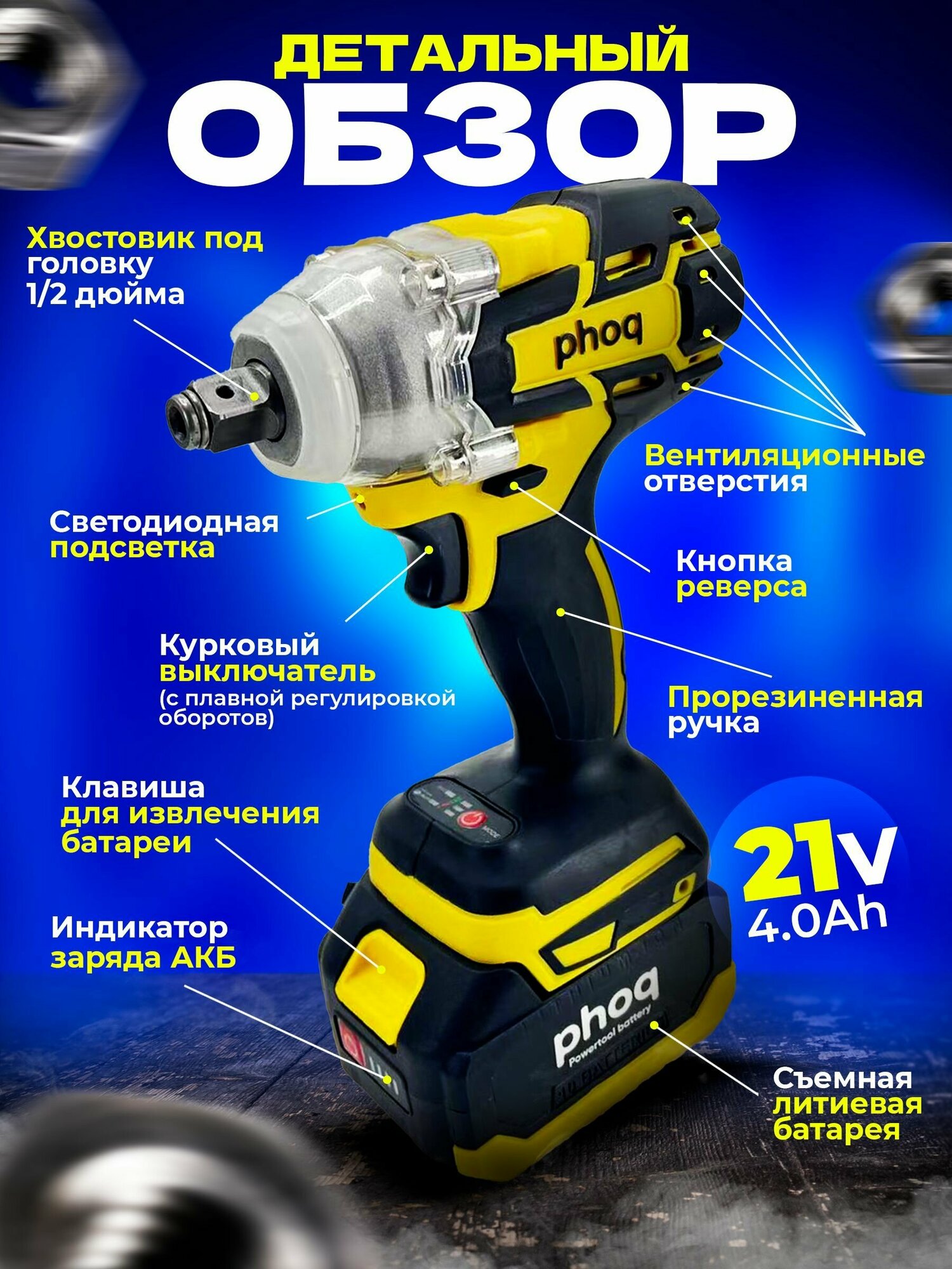 Гайковерт бесщеточный ударный аккумуляторный PHOQ 2 скорости, 1600 об/мин, интересное: