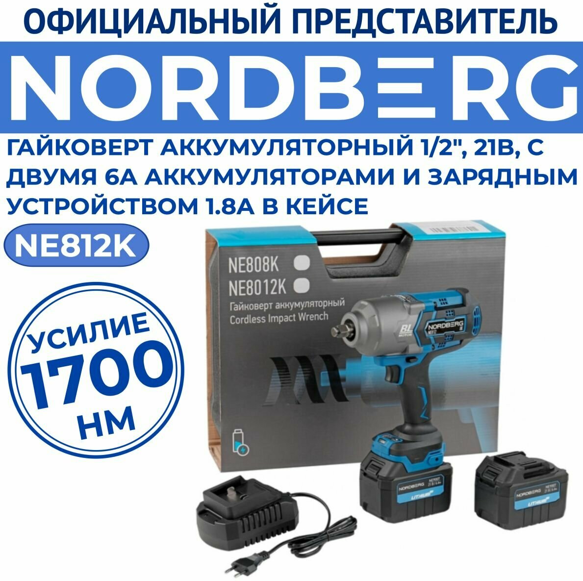 | Комплектация | Гайковерт аккумуляторный, 1/2", 21В, 1700 Нм с двумя 6A акк. и зар. уст-вом 1,8A, в кейсе NORDBERG NE812K |