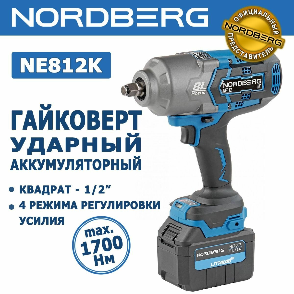 Купить Гайковерт аккумуляторный, 1/2", 21В, 1700 Нм с двумя 6A акк. и зар. уст-вом 1,8A, в кейсе NORDBERG NE812K