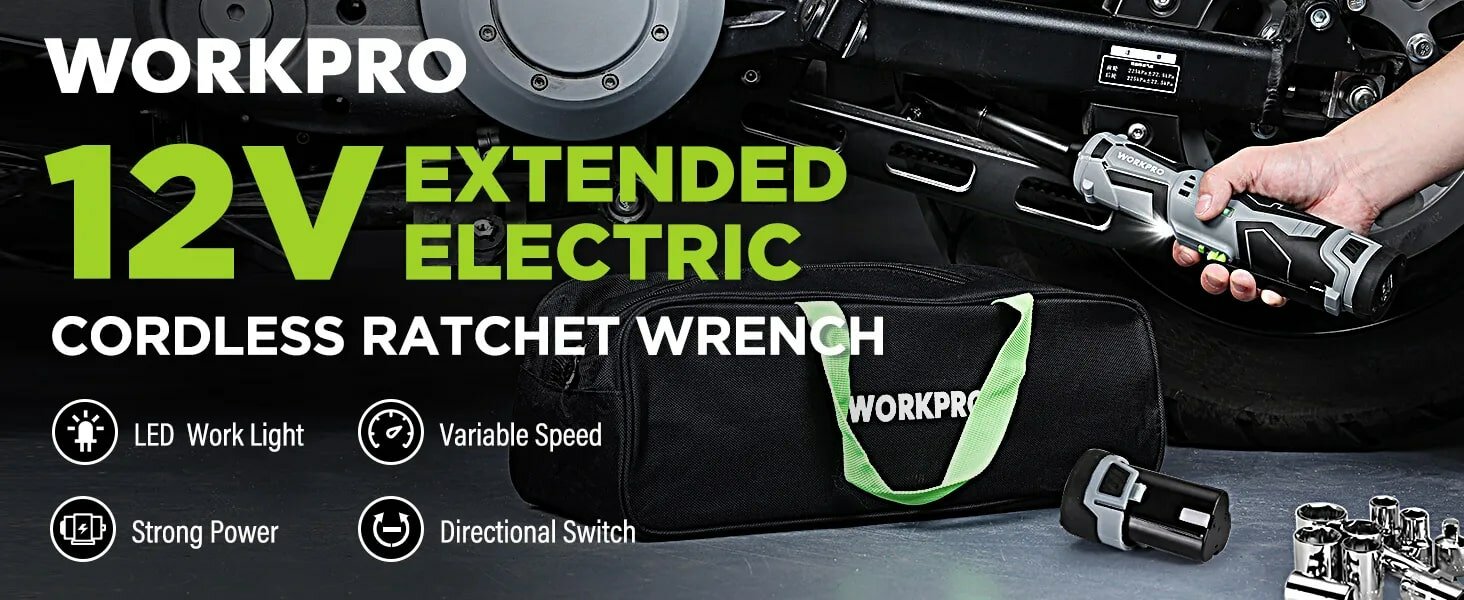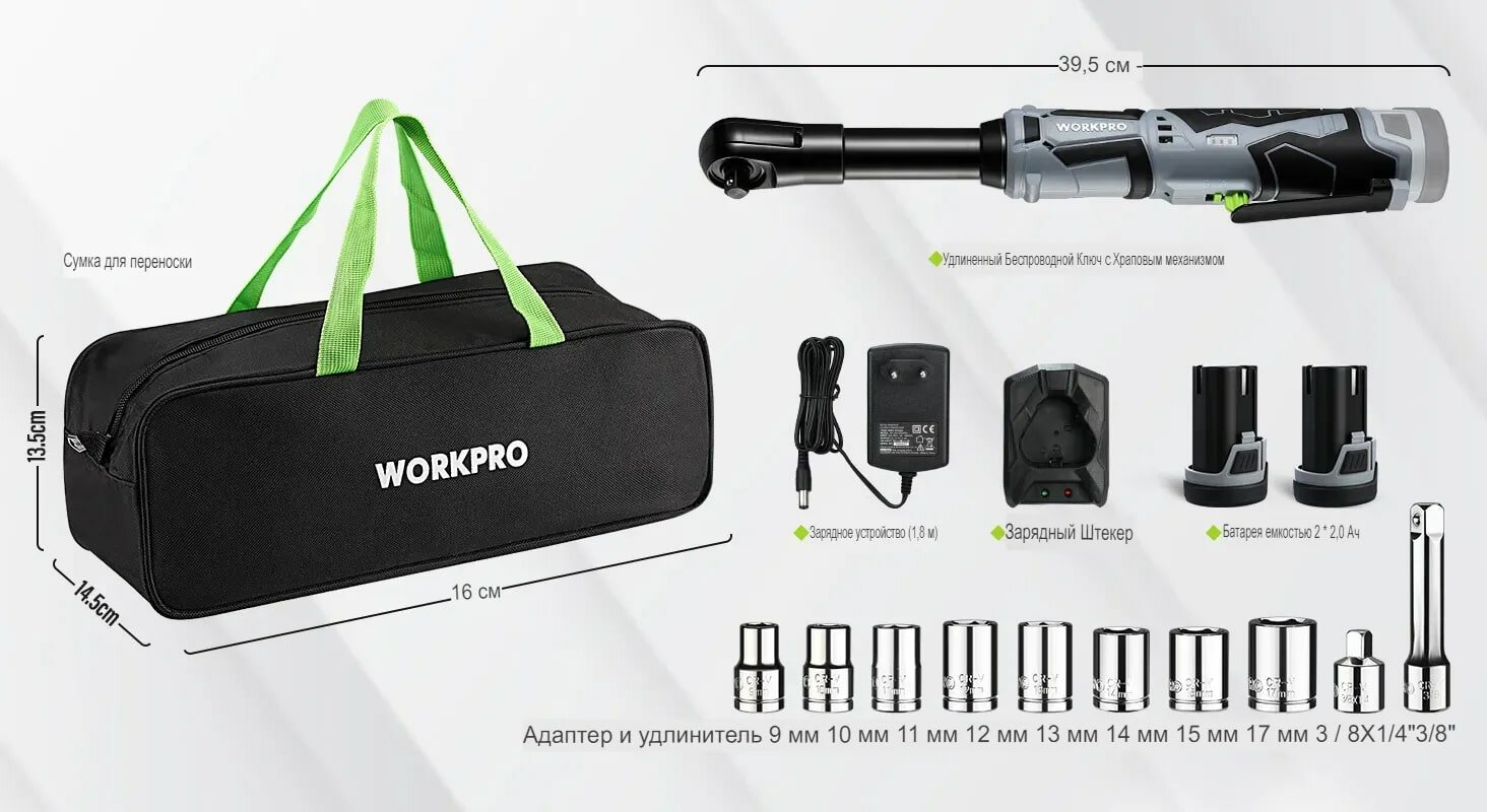 Купить Аккумуляторный угловой гайковерт Workpro с удлиненной головкой, с двумя аккумуляторами 12В, 2Ач, с храповым механизмом