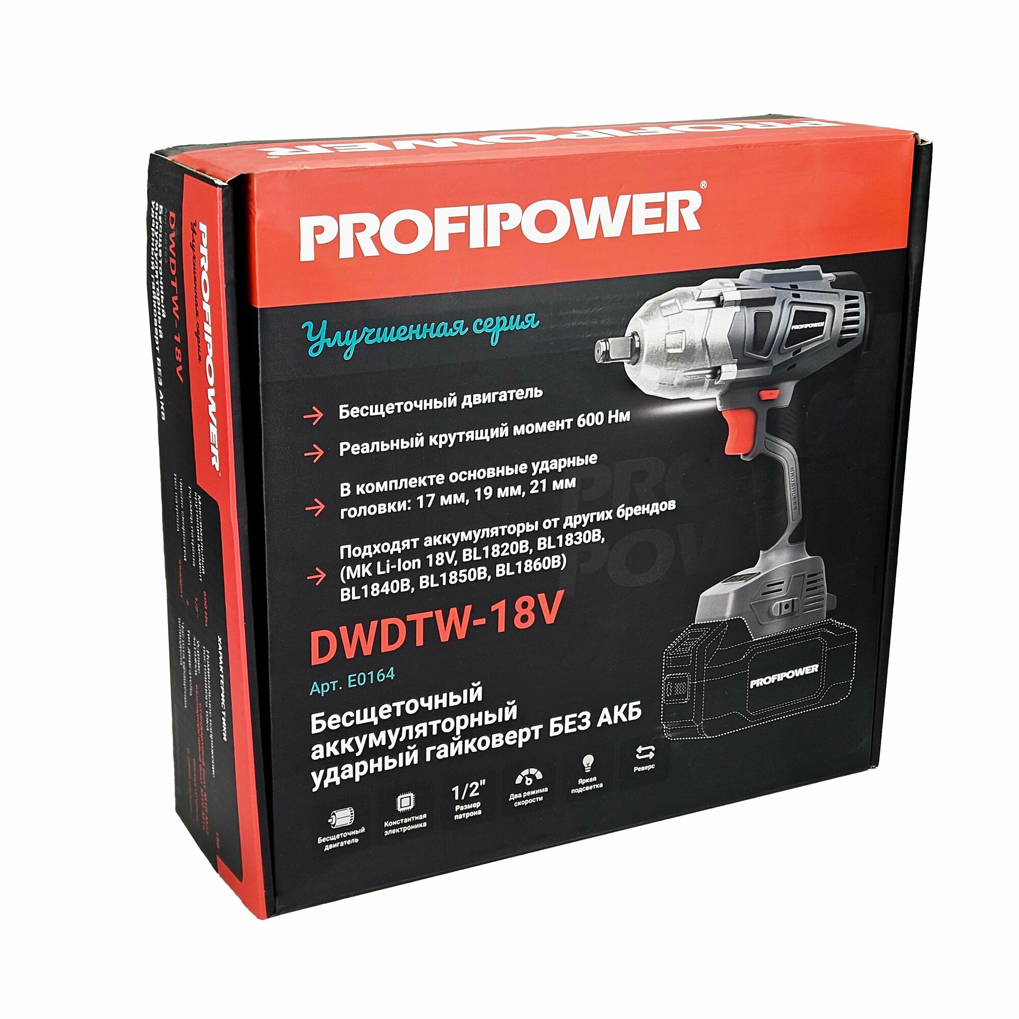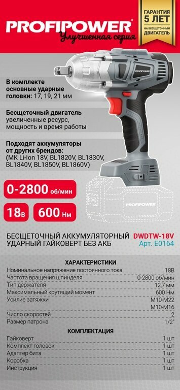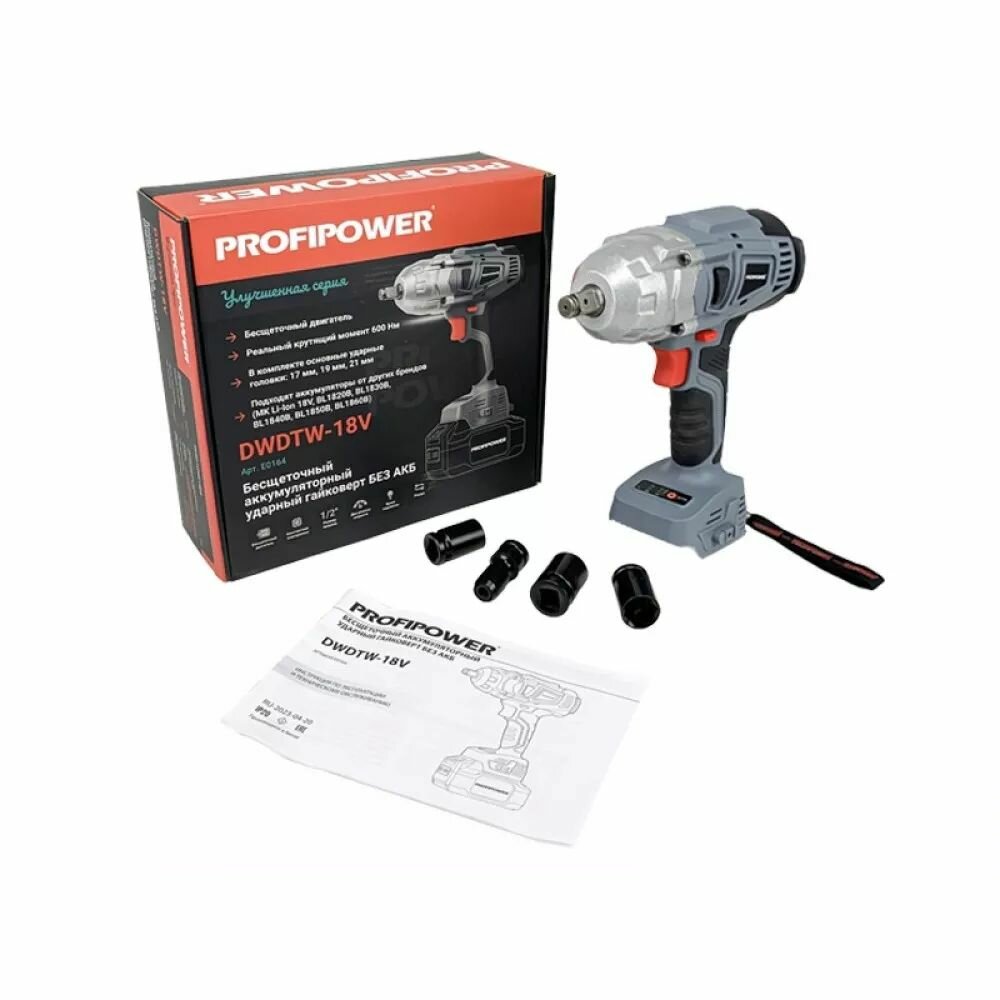 Гайковерт E0164 бесщеточный ударный ProfiPower DWDTW-18V, без АКБ и ЗУ, 600Нм, набор головок 17/19/21мм в комплекте