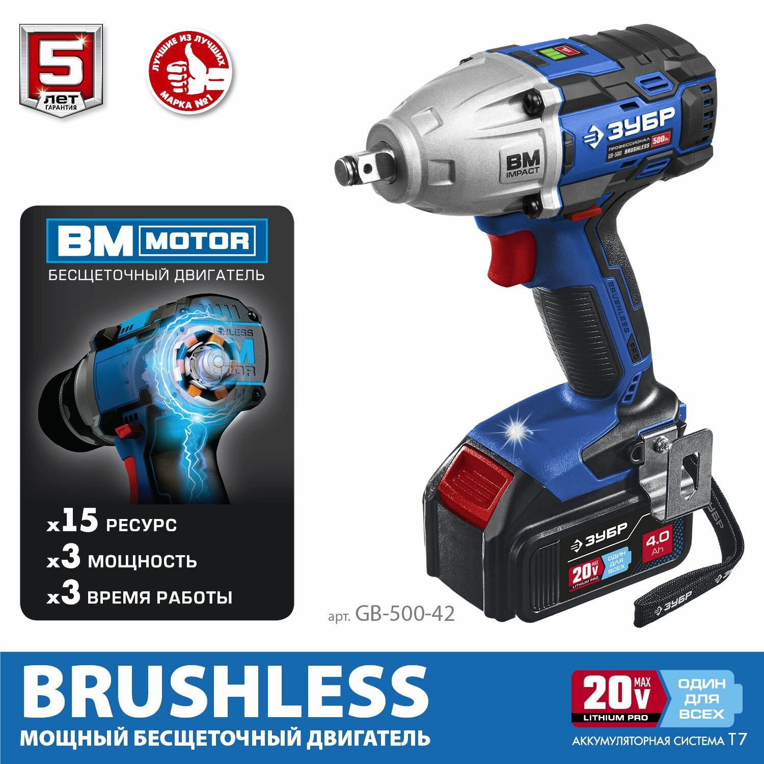 ЗУБР Т7, 20 В, 500 Н·м, 2 АКБ (4 А·ч), бесщеточный гайковерт, кейс, Профессионал (GB-500-42)