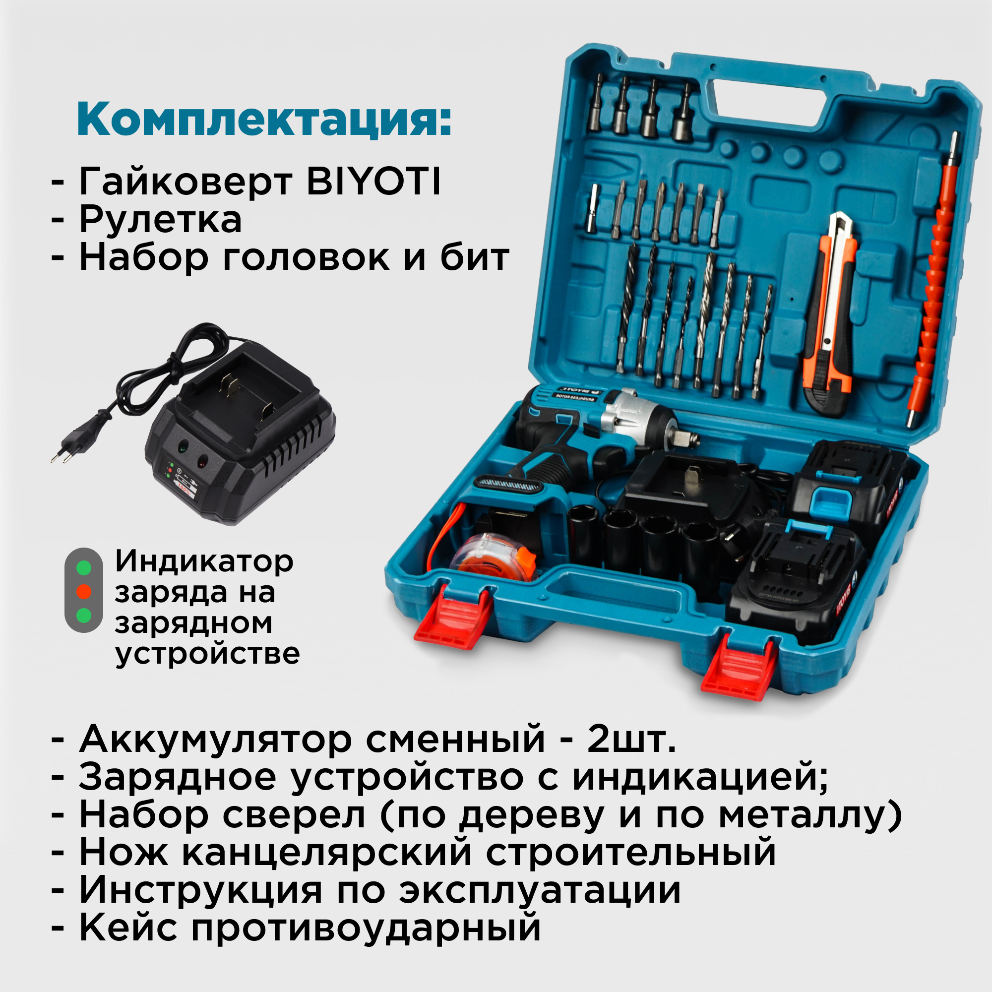 | Комплектация | Гайковерт аккумуляторный; Аккумулятор сменный - 2шт.; Зарядное устройство с индикацией; Рулетка; Набор головок; Набор сверел (по дереву и по металлу); Набор бит; Нож канцелярский строительный; Инструкция по эксплуатации; Кейс пластиковый. |