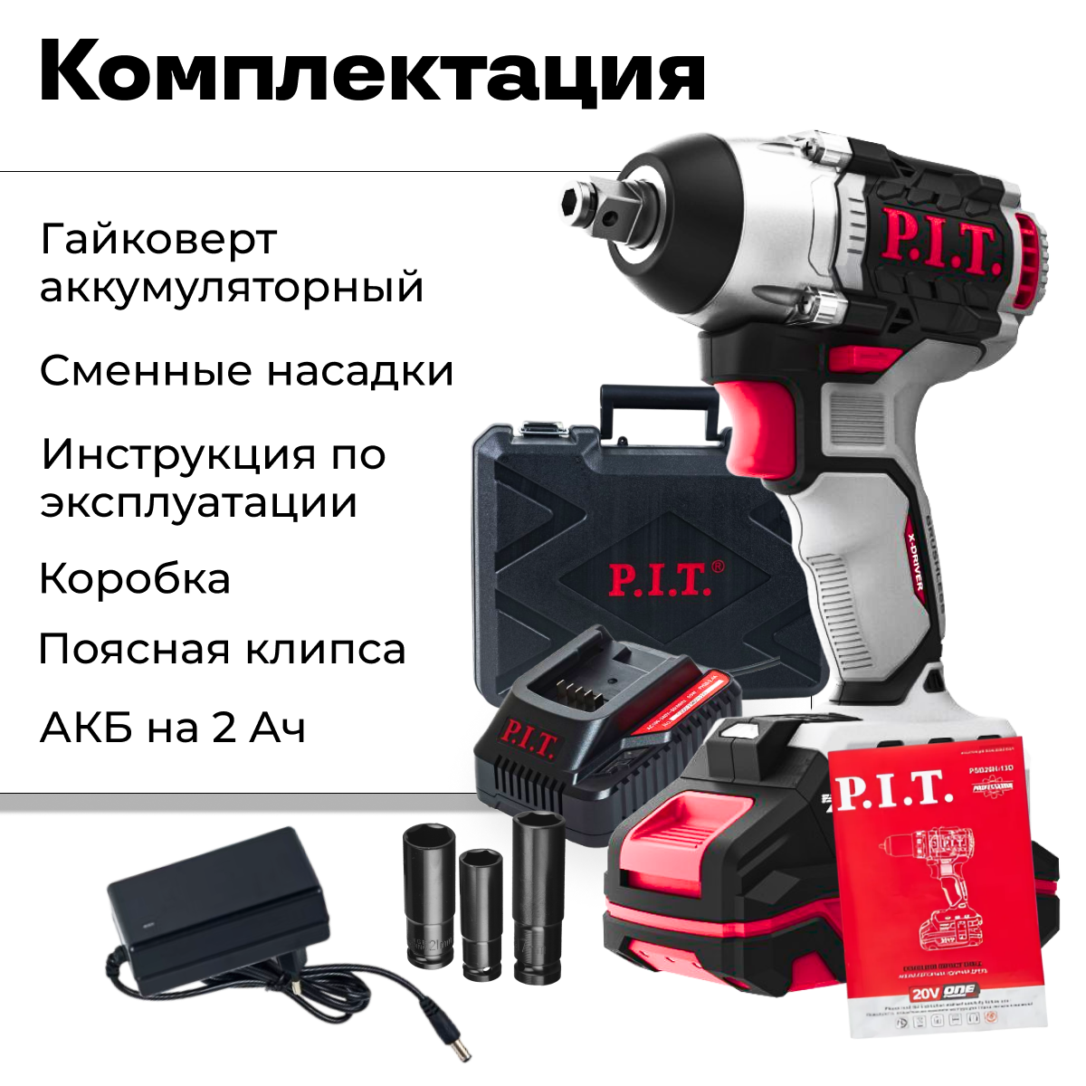 | Комплектация | Гайковерт, кейс, набор головок, металлическая скоба, 1 аккумулятор, зарядное устройство, руководство по эксплуатации |