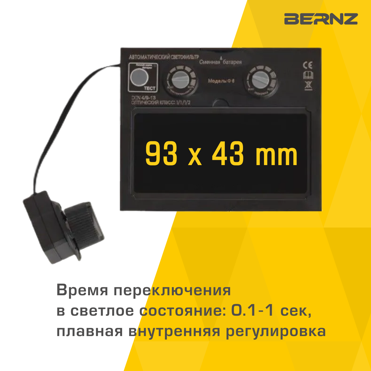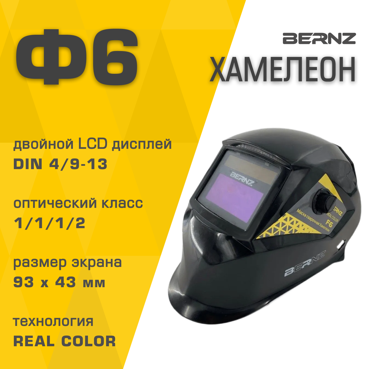 Маска сварщика BERNZ Ф6 черная, Хамелеон 93х43мм, DIN 4/9-13, внешняя регулировка, в коробке интересное: