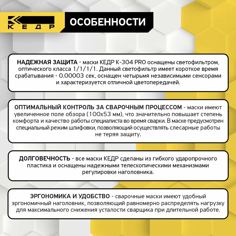 Маска сварочная хамелеон кедр К-304 PRO, желтая сварочная маска, светофильтр 4/5-8/9-13 DIN , 4 датчика , для TIG/MIG/MAG интересное: