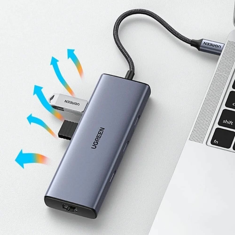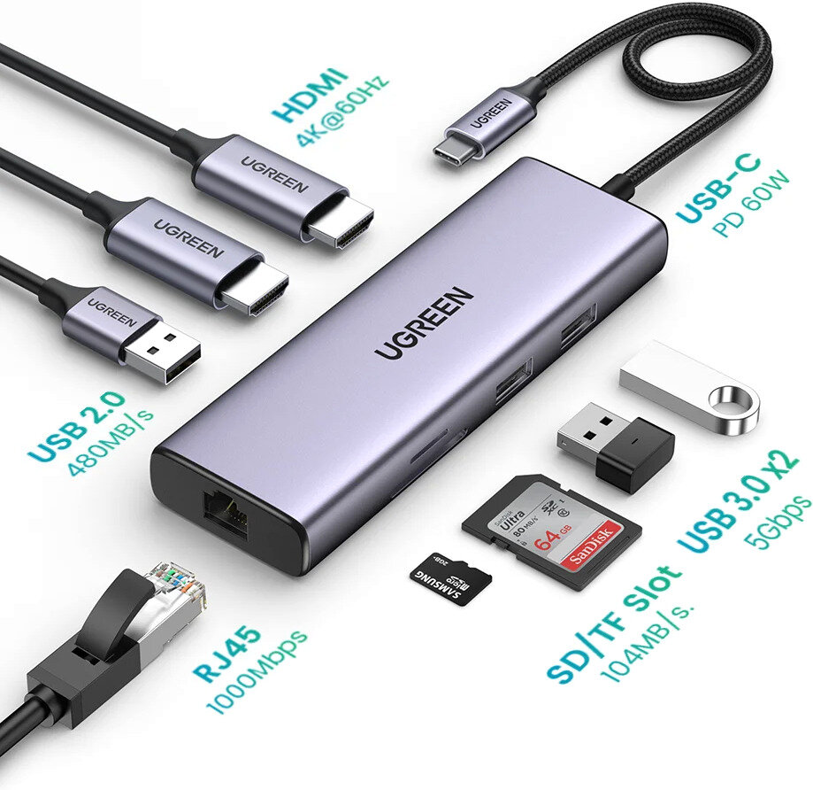 Конвертер Ugreen CM490 USB-C - 2xUSB 3.0+1xUSB 2.0+2xHDMI+RJ45(1000M)+SD+TF+PD Grey 90119 интересное: