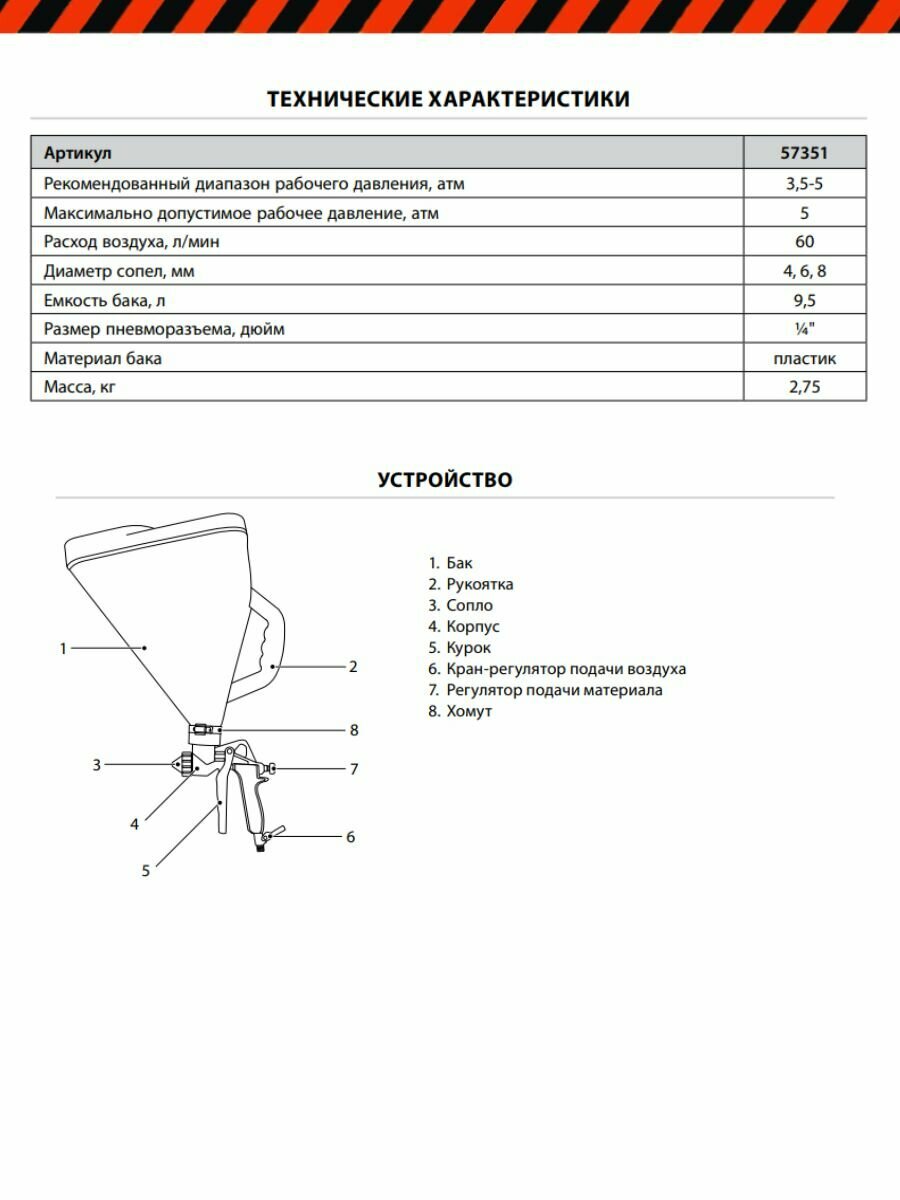 | Комплектация | Картушный пистолет - 1 шт, Штуцер с краном - 1 шт, Бак - 1 шт, Сменное сопло диаметром 4 мм - 1 шт, Сменное сопло диаметром 6 мм - 1 шт, Руководство по эксплуатации и гарантийный талон - 1 шт |