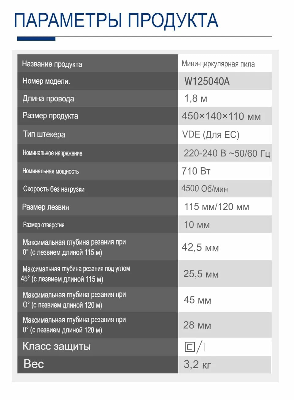 | Комплект поставки | мини-циркулярная пила, диск 120мм.-1шт, диск 115мм.-1шт., шестигранный ключ, параллельная направляющая, инструкция по эксплуатации. |