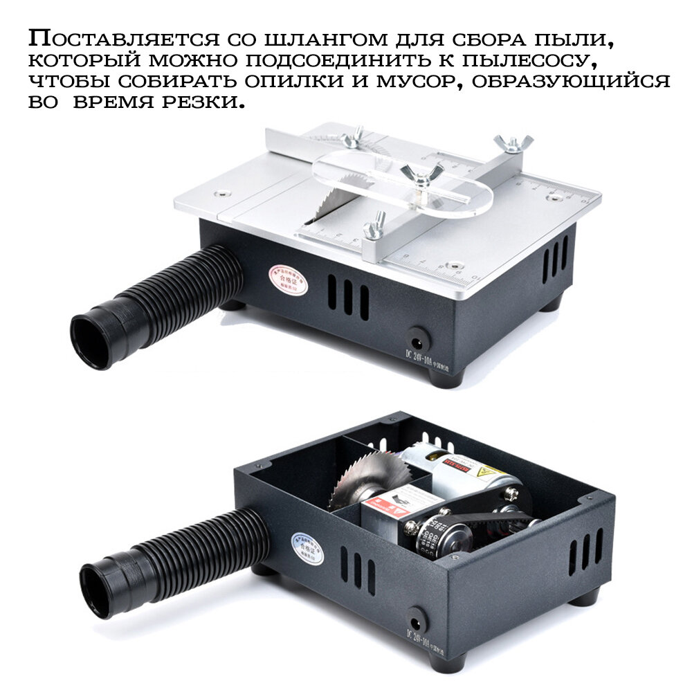 | Комплект поставки | мини-пила для стола-1 шт.; адаптер питания-1 шт; Аппликативный пильный диск-3 шт.; Шлифовальный диск-1 шт., шланг для пылесборника-1 шт. |