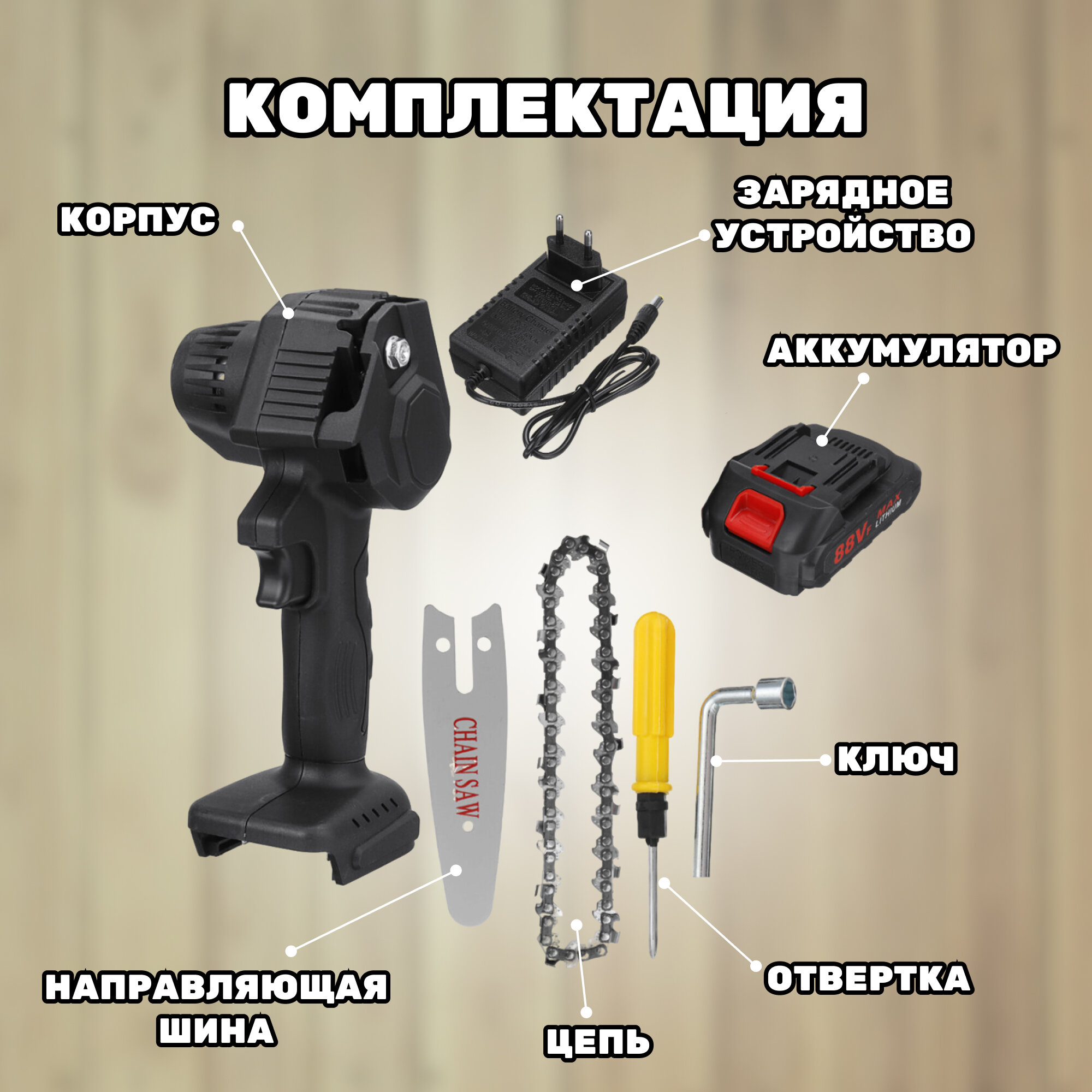 | Комплект поставки | 1 ручная цепная пила 1 батарея 1 зарядное устройство 1 отвертка 1 ключ, дюймовый стандарт 1 Инструкция |