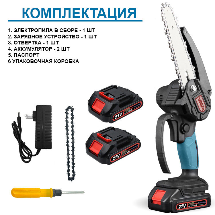 | Комплект поставки | 1* электропила; 1*отвертка; 1*торцевой ключ; 2*аккумулятор; 1*зарядное устройство; 1* руководство; 1 упаковочная коробка; 1* ЗАПАСНАЯ ЦЕПЬ (подарок) |