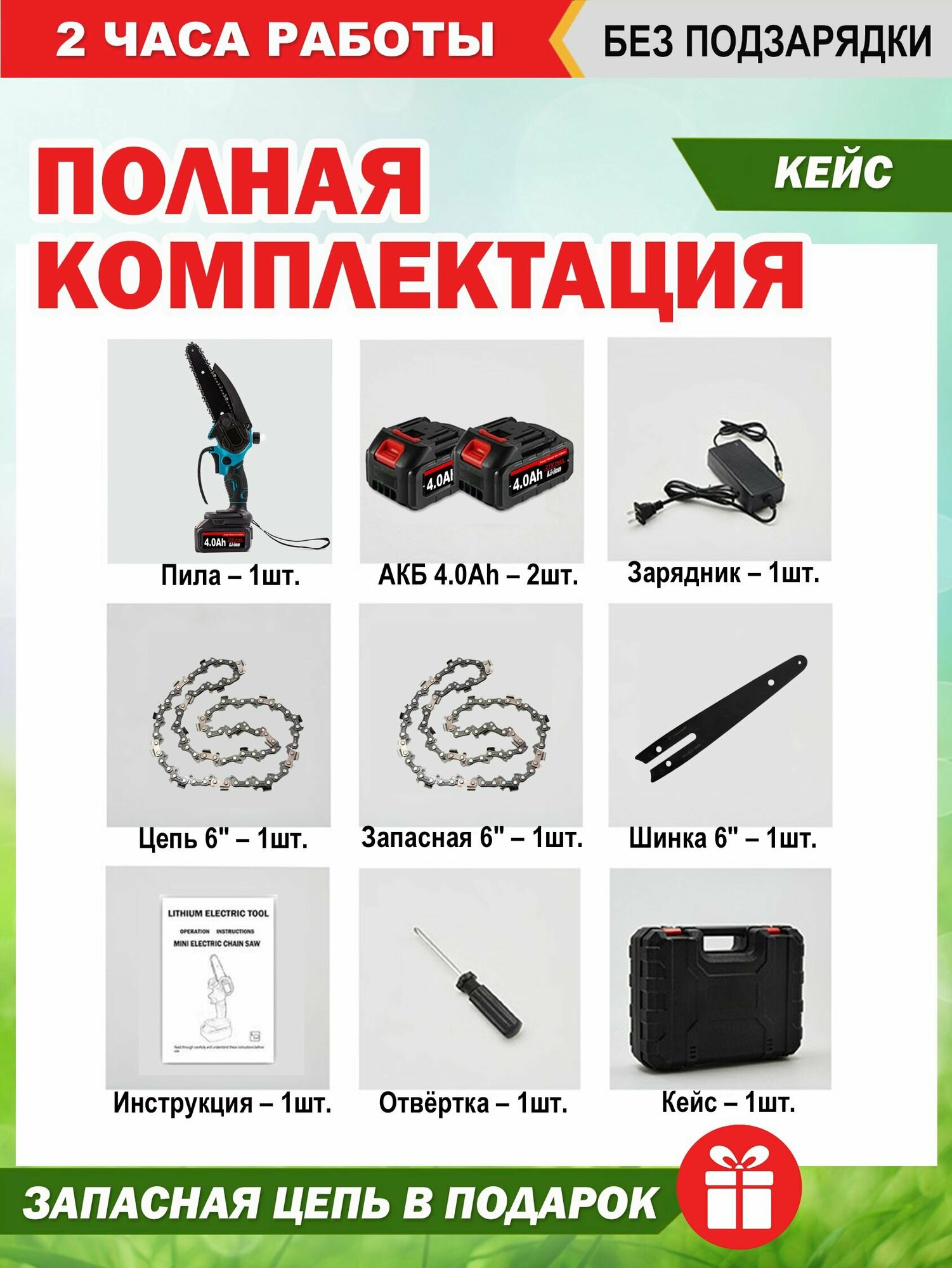 | Комплект поставки | Пила - 1шт., аккумулятор 4mAh - 2 шт., кейс - 1 шт., направляющая - 1шт., цепь - 2 шт., отвёртка - 1шт. |