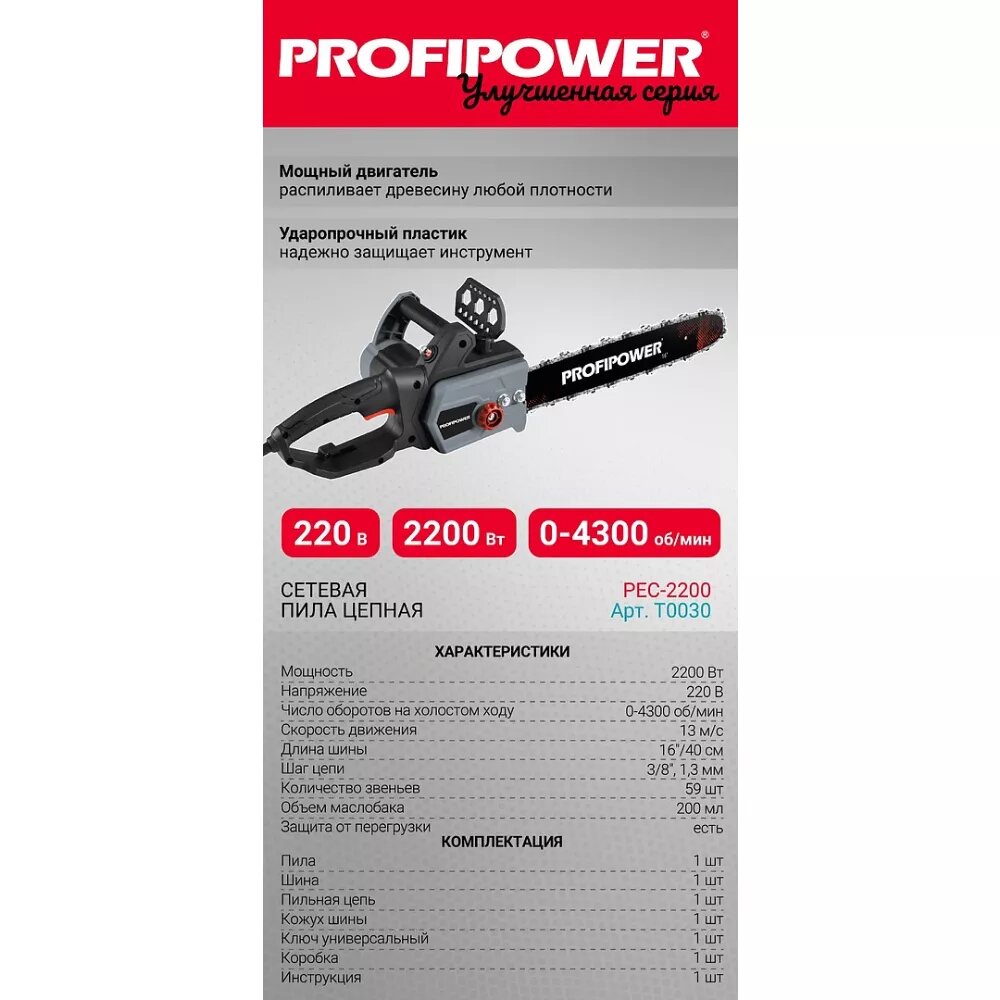 Пила цепная Profipower EC-2200, 16", 2200 Вт, с механической подачей масла интересное: