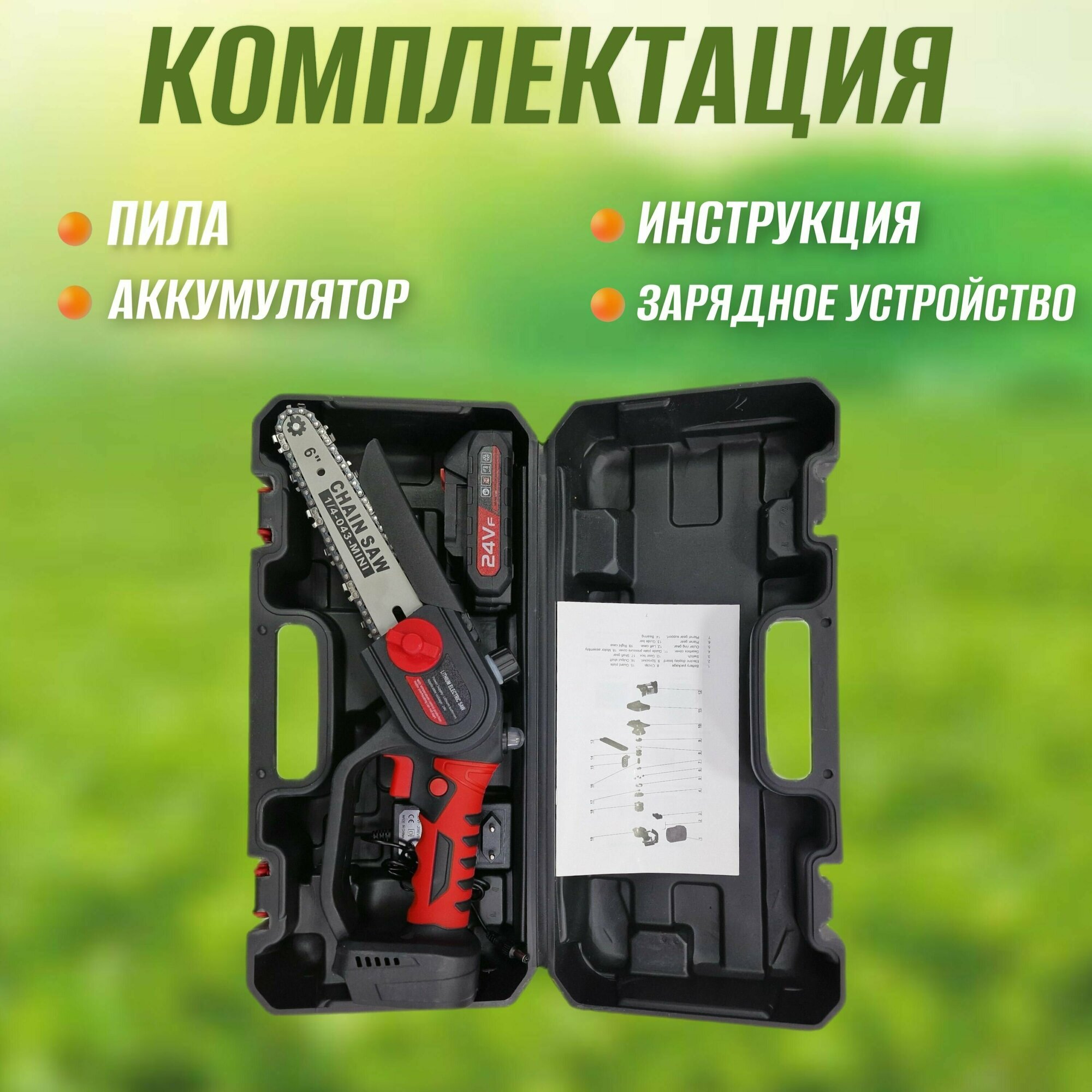 Мини пила аккумуляторная цепная садовая с бесщёточным мотором в чемодане 6 дюймов (15см) 24V 1500мАч интересное: