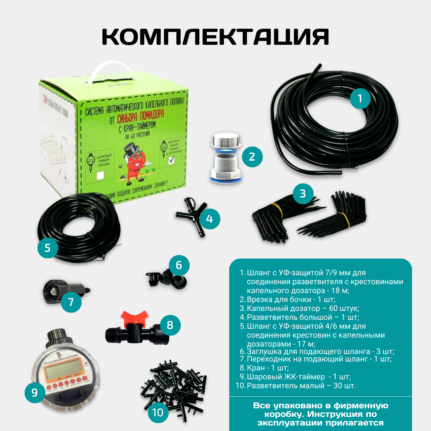| Комплектация | Таймер шаровый автоматический - 1 шт, шланг магистральный 7/9 мм - 18 м, шланг подающий 4/6 мм - 17 м, капельницы - 60 шт, кран - 1 шт, заглушка для подающего шланга - 3 шт, малый разветвитель - 30 шт, врезка для бочки - 1 шт, разветвитель с пробкой - 1 шт, инструкция по эксплуатации - 1 шт, упаковочный короб - 1 шт. |