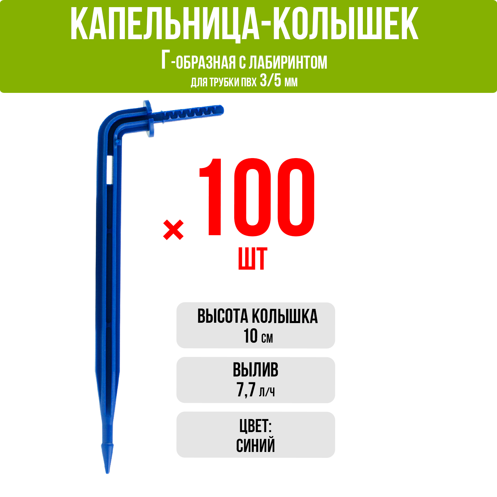 Капельница Г-образная с лабиринтом, 10см, 7,7л/ч, синяя (подключается к трубке ПВХ 3/5мм) - 100 штук