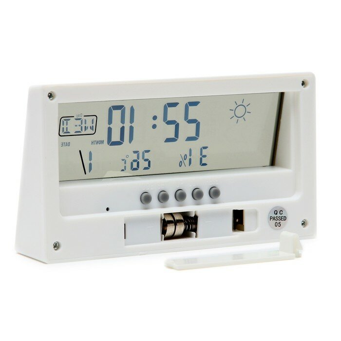 Купить Часы настольные электронные: будильник, термометр, календарь, гигрометр, 13.3х7.4 см, белые