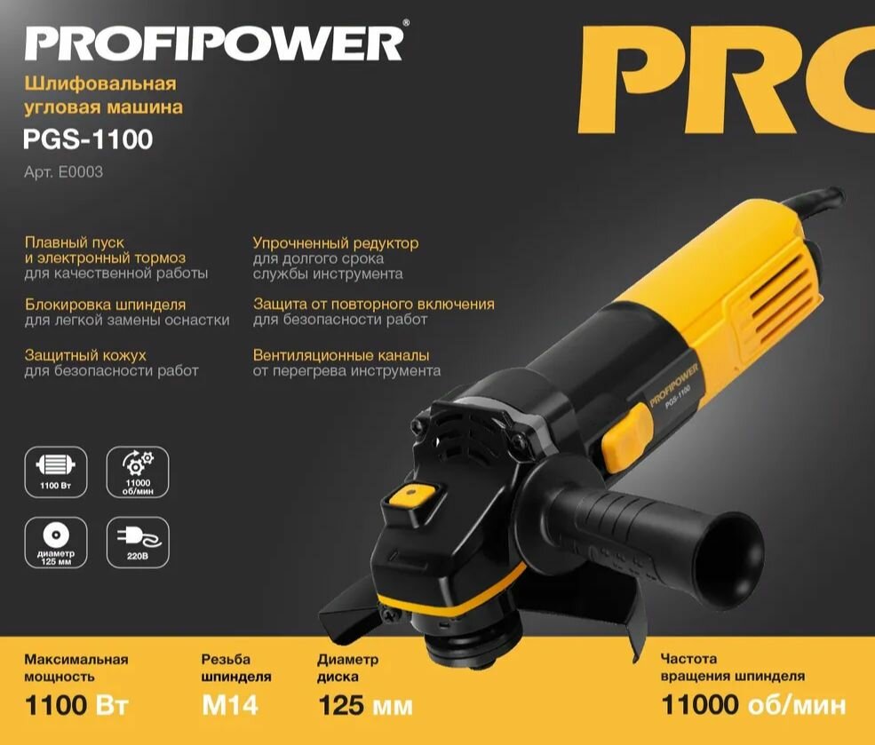 УШМ PGS-1100 1050Вт 125 мм, 11000 об/мин, в коробке ProfiPower интересное: