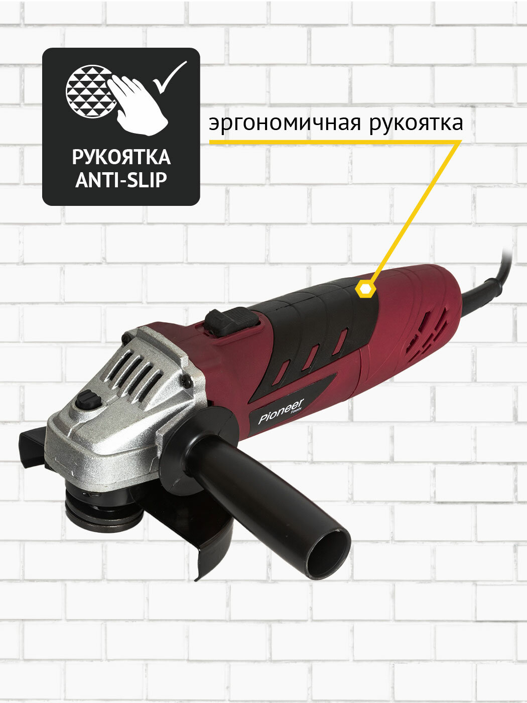 Купить Угловая шлифовальная машина сетевая Pioneer с щеточным двигателем, плавный старт, блокировка шпинделя, 2 положения рукоятки Anti-Slip, 750 Вт