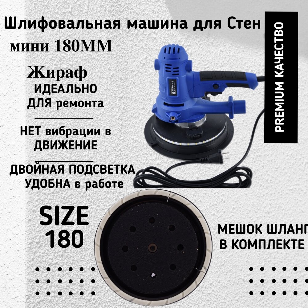 Шлифовальная машинка для стен и потолка жираф REMTOOLS, 180 мм, 1250 Вт, с LED подсветкой / Шлифмашинка эксцентриковая