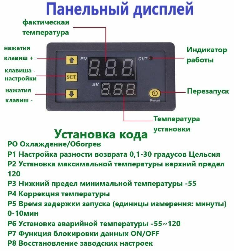 Регулятор температуры, термостат с цифровым дисплеем универсальный нагрев/охлаждение W3230 24 В от -50 - 120 градусов
