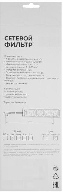 Сетевой фильтр 4 розетки, 1.0 м, 2200 Вт, 3 x 0.75 мм2, 10 A, 220 В, белый