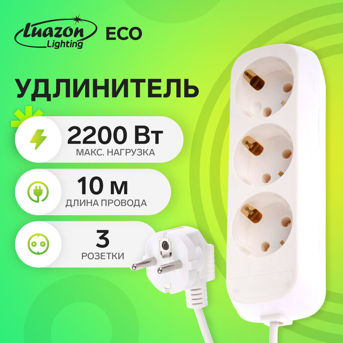Купить Luazon Lighting Удлинитель Luazon Lighting ECO 3 розетки, 10 м, 10 А, 2200 Вт, ПВС 3х0.75 мм2, с з/к, белый