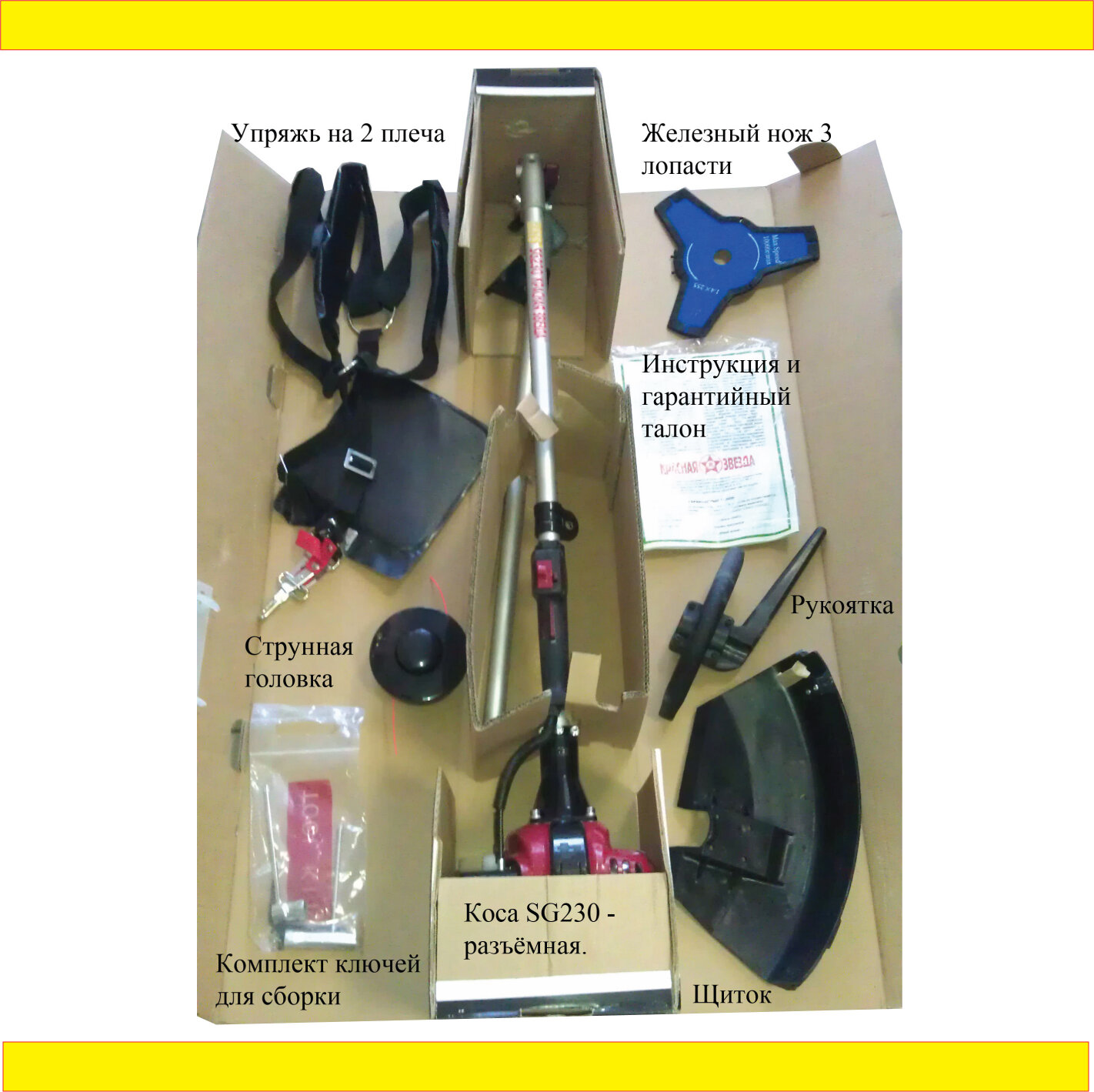 | Подробная комплектация | Косилка, упряжь, щиток, рукоятка, струнная головка, нож, ключи, паспорт |