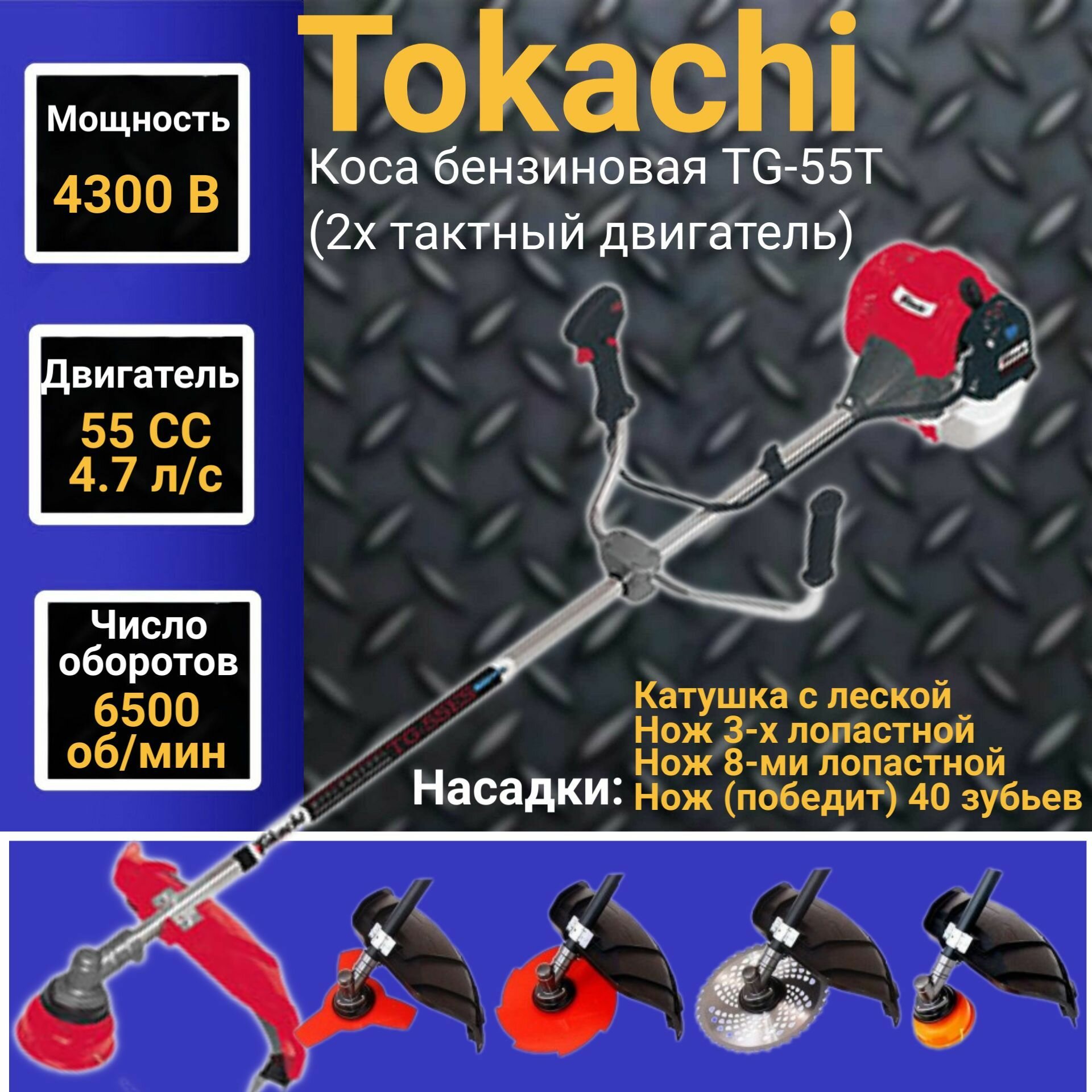 Коса бензиновая Tokachi TG-55T (2х тактный двигатель), 55 СС, 4300Вт, 6500об/мин, 415мм Триммер, Газонокосилка интересное: