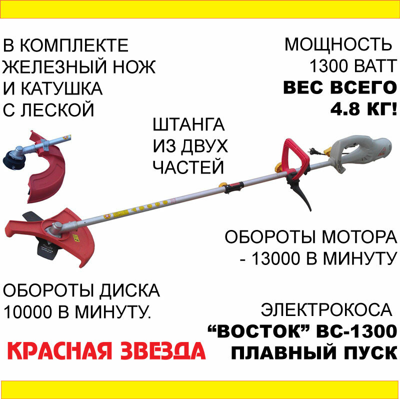 Купить BC1300 "Восток". Электрокоса красная звезда (1.3кВт) с верхним мотором и плавным стартом! Разъемная штанга