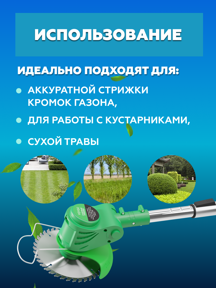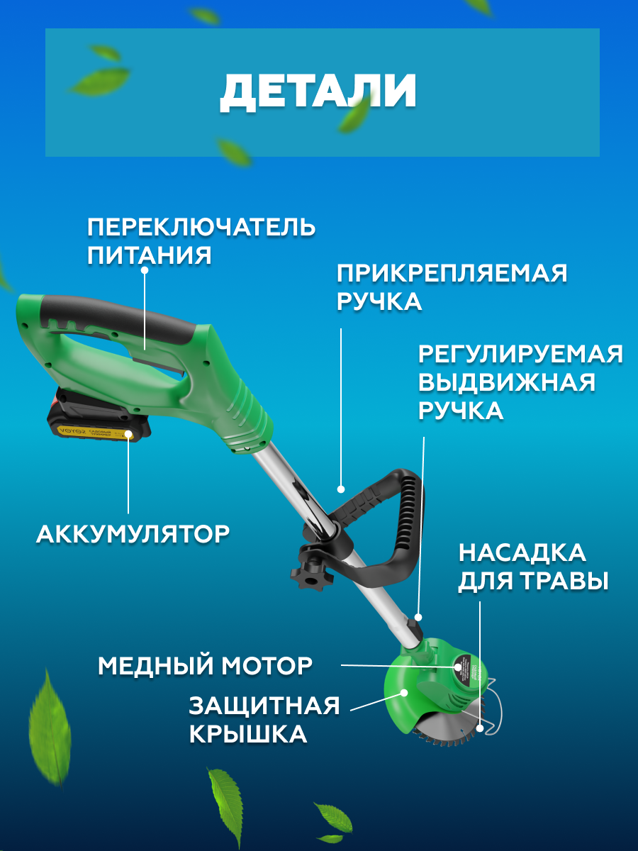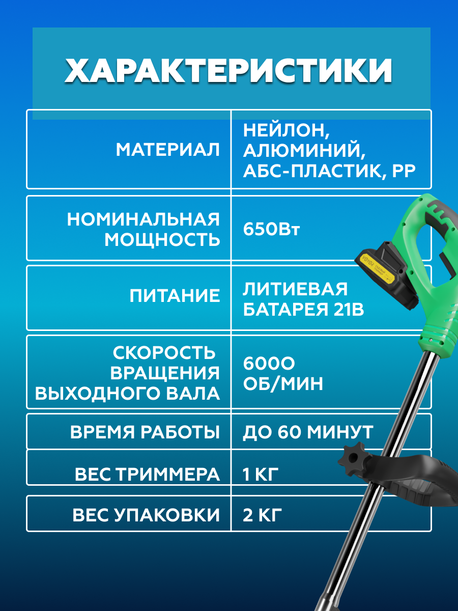| Подробная комплектация | триммер, 10 пластиковых лезвий, 2 металлических лезвия, 2 пильных диска, 2 аккумулятора на 21В, 1 зарядное устройство, 1 ручка, коробка и инструкцию на русском языке. |