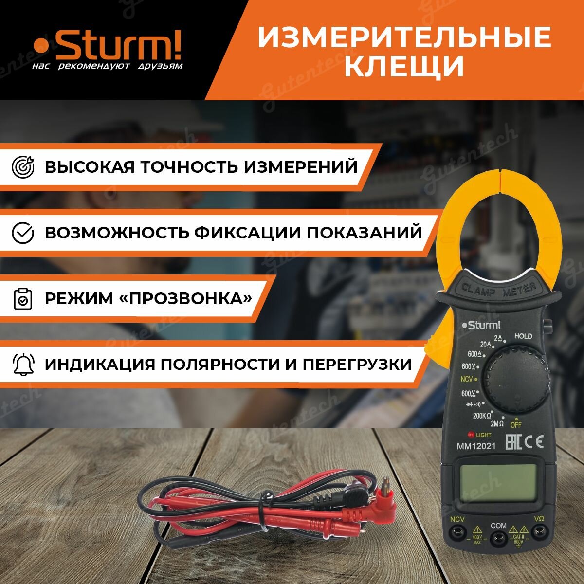 MM12021 Мультиметр Sturm! токоизмерительные клещи, изм: DC, ACV, ACA, R. свет.индик. Фазы