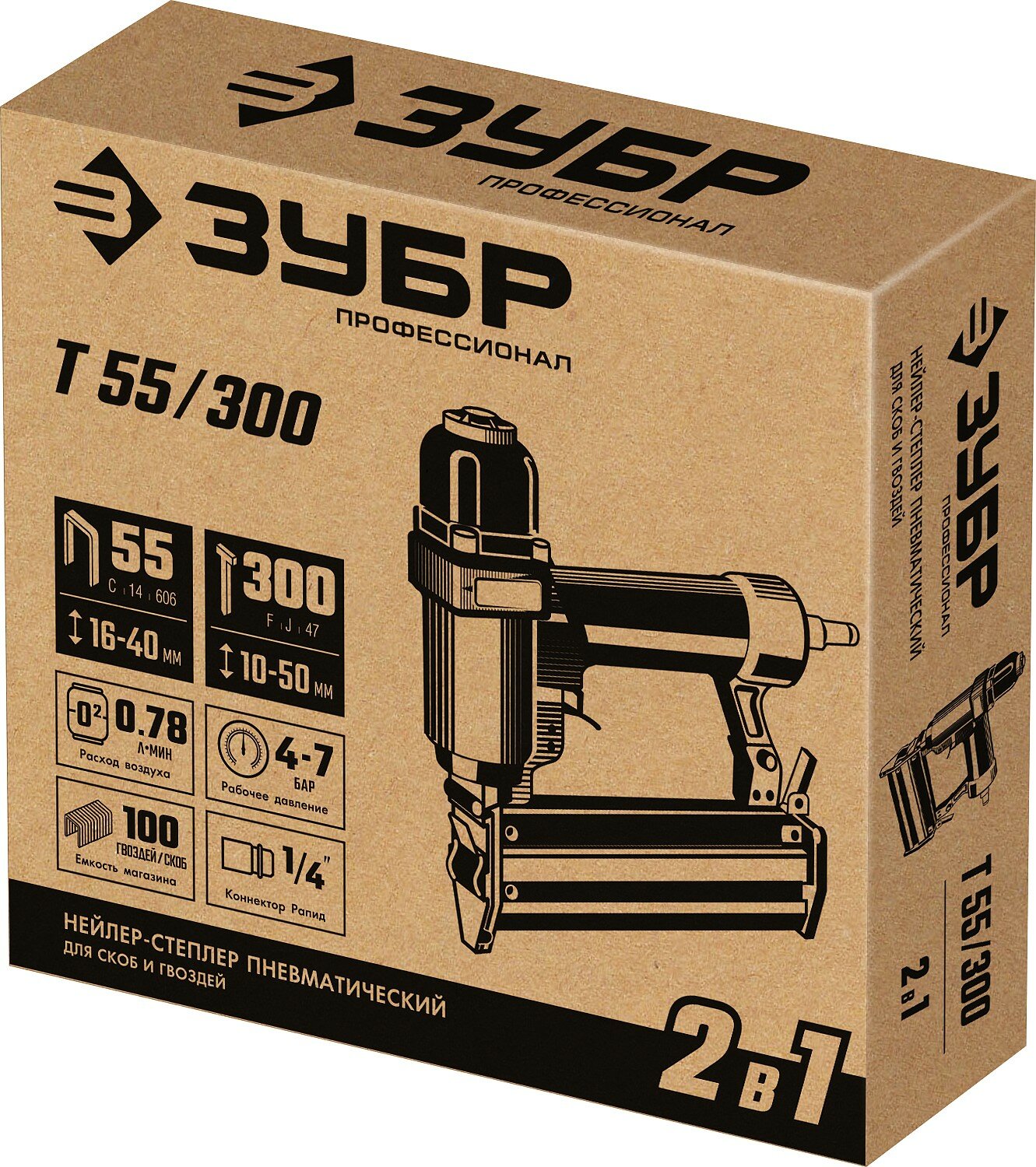 ЗУБР Т55/300 скобы тип 55 (16-40мм), гвозди 300 (10-50 мм), Пневматический нейлер-степлер (гвозде/скобозабиватель) 2-в-1, Профессионал (31937) интересное: