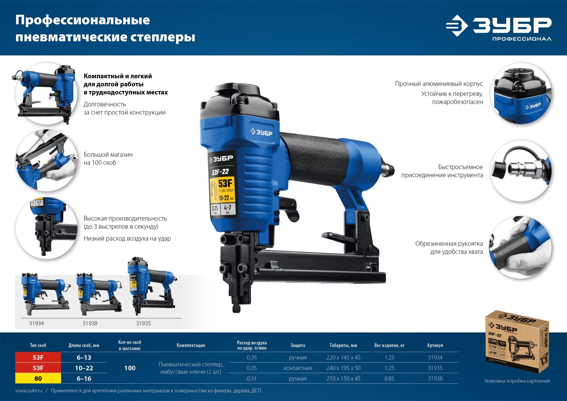 ЗУБР 53F-13, скобы тип 53F (6-13 мм), Пневматический степлер (скобозабиватель), Профессионал (31934) интересное: