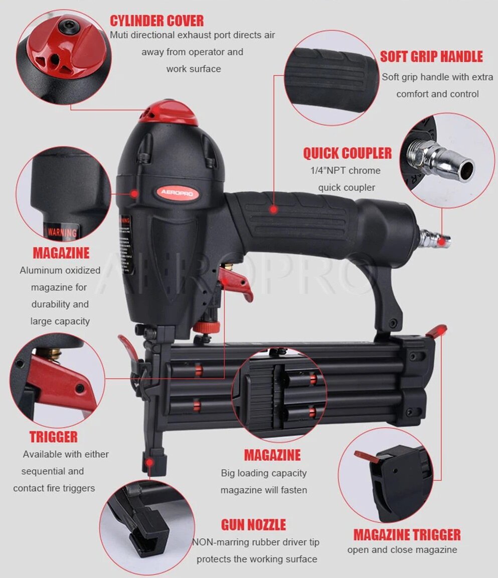 Нейлер-степлер пневматический 2 в 1, гвозди 18GA 15-50 мм, скобы 18GA 16-40 мм AERORPO SF5040E интересное: