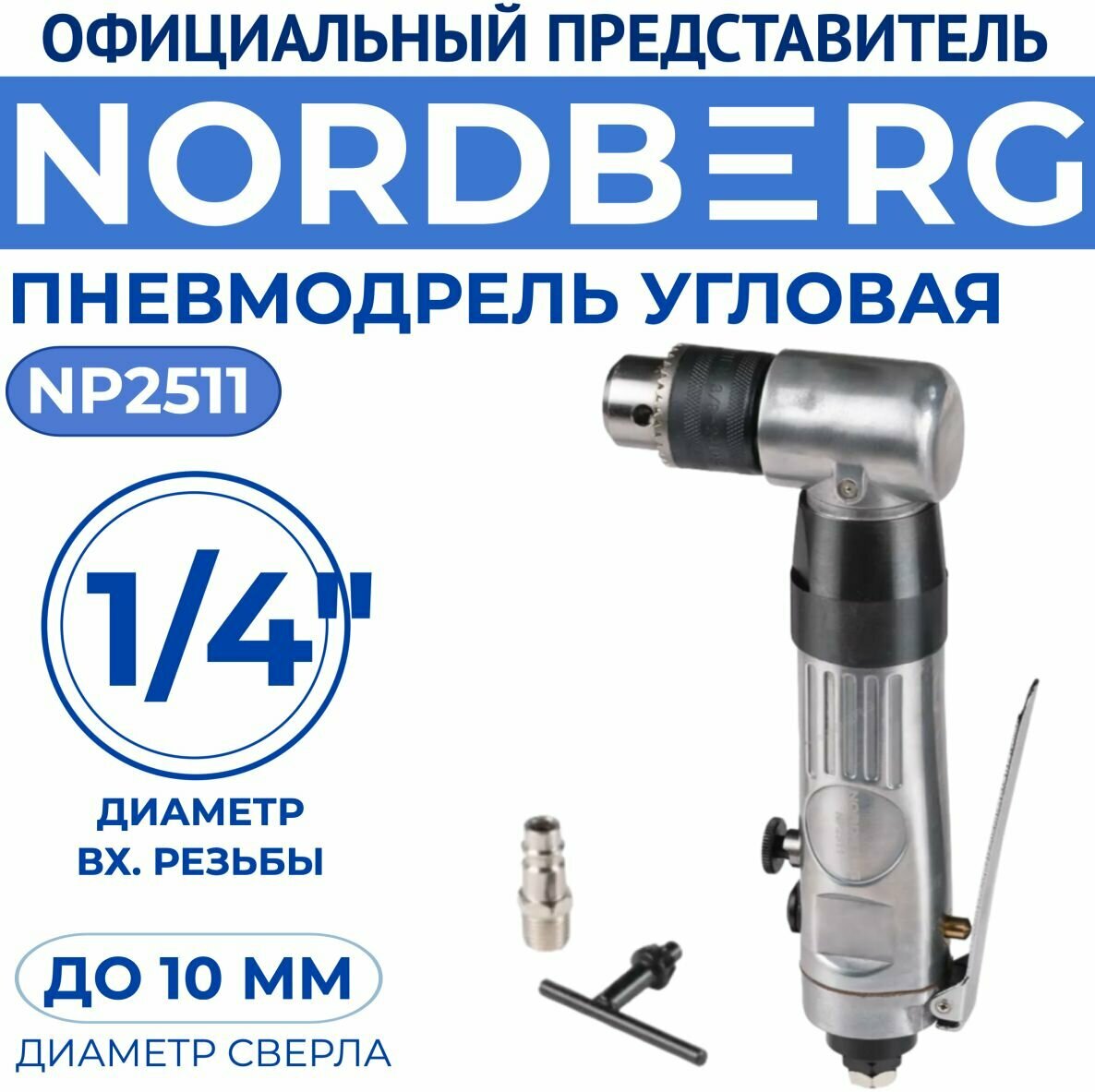 | Комплектация | ПНЕВМОДРЕЛЬ угловая до 10 мм NORDBERG NP2511 |