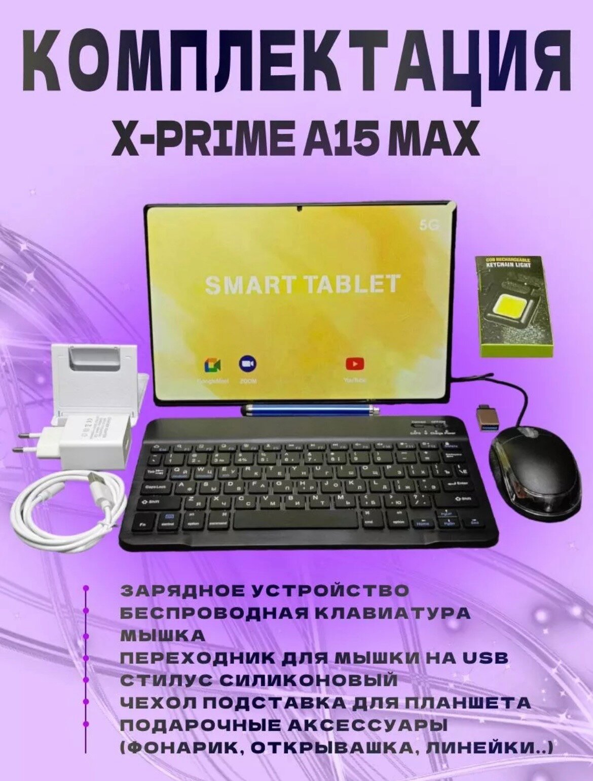 | Комплектация | Планшет, чехол, клавиатура, блок, кабель, переходник OTG, подставка, мышь, стилус, фонарик |