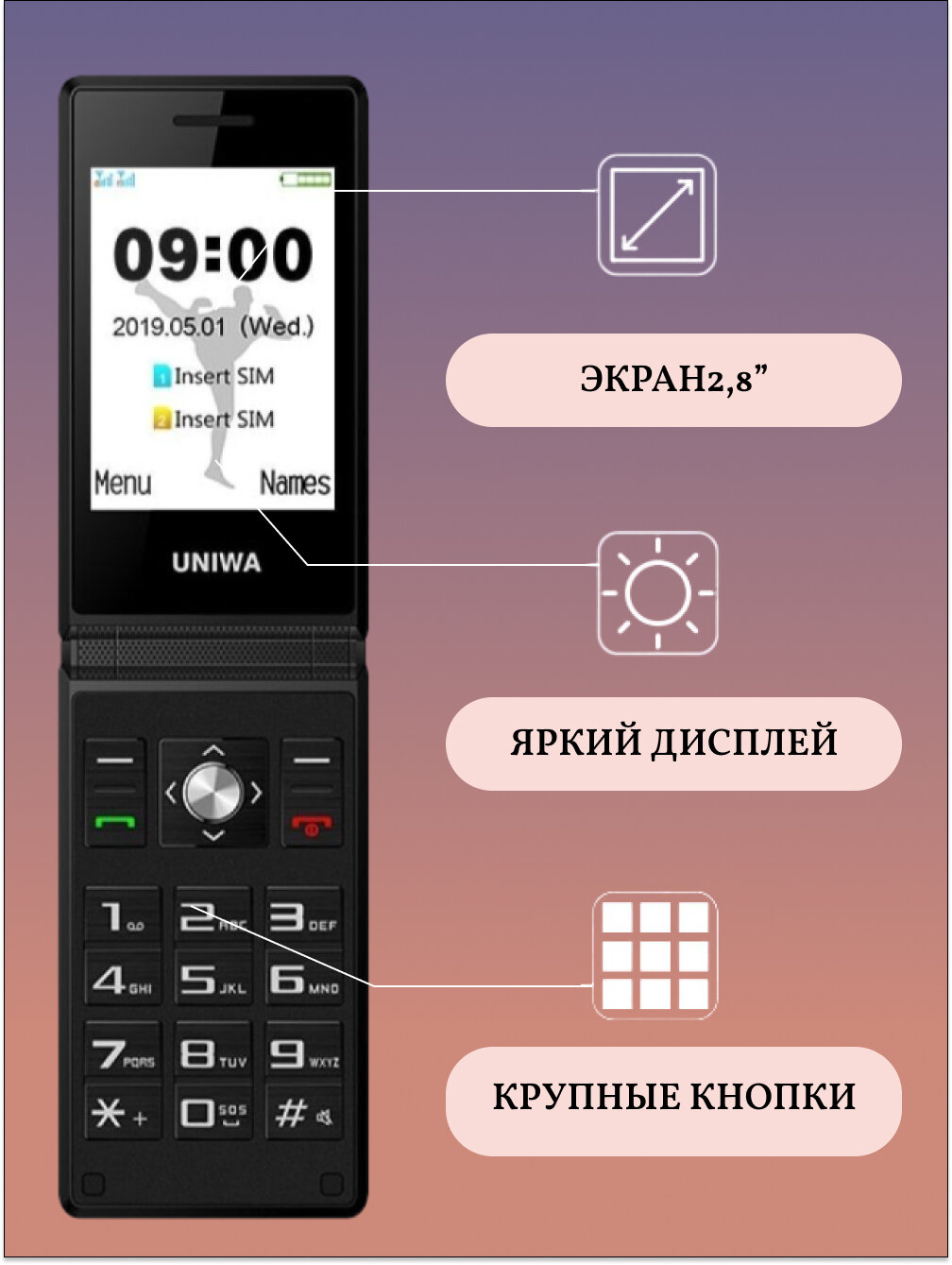 UNIWA X28 Flip Телефон раскладушка кнопочный мобильный
