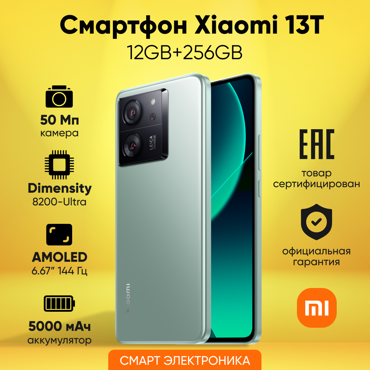 Смартфон Xiaomi 13T RU 8+256 M12A/Meadow Green|6.67”AMOLED/2712×1220/144Hz/MT8200U/And13/50+50+12MP/20MP/5000mAh