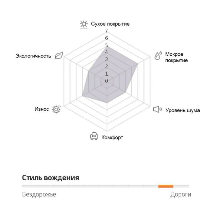 | Минусы: | сцепные свойства на мокрой дороге, раннее аквапланирование |
