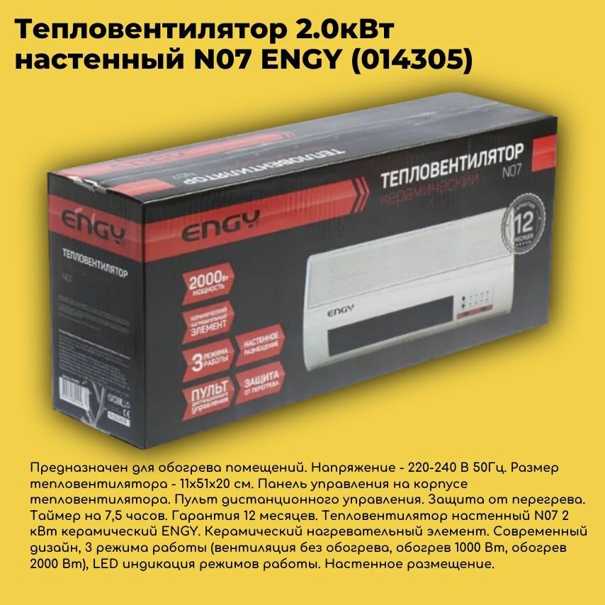 Тепловентилятор настенный Engy N07, 2кВт, керам. нагрев., 3реж., пульт ДУ 14305