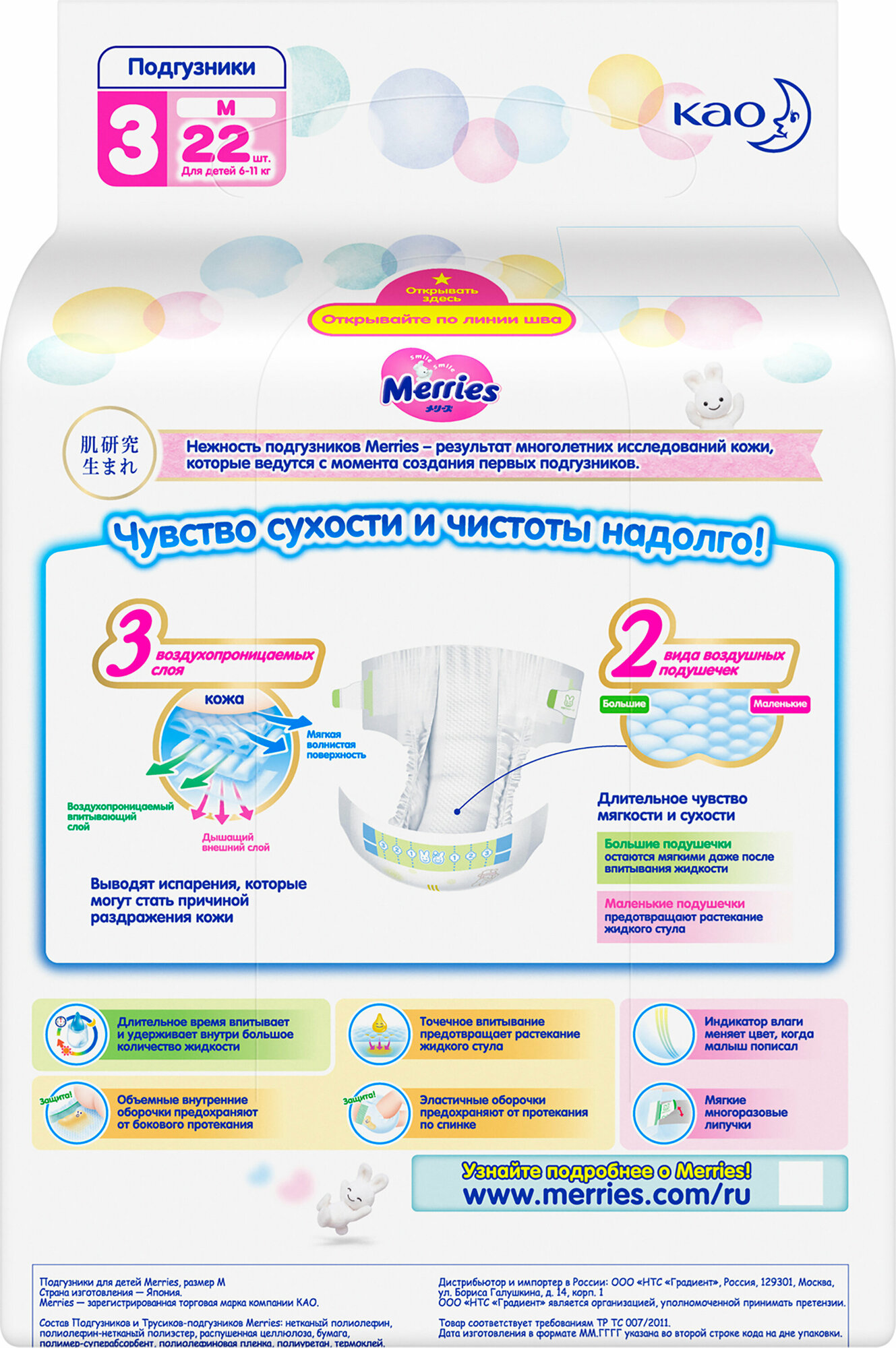 Наполненный подгузник снаружи более влажный, чем внутри. На 11-килограммового ребёнка будут малы. До 9 кг, а дальше — следующий размер. Это справедливо для всех размеров Merries: как только вес доходит до минимальной границы следующего размера, лучше брать следующий. Иначе подгузник может впиваться в ножки и натирать. |