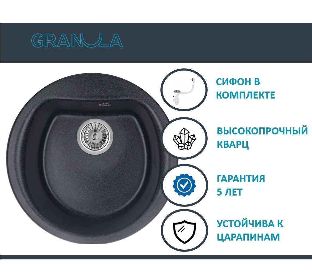 Кухонная мойка кварцевая Granula GR-5101 односекционная круглая, врезная, чаша 440x385, цвет шварц (5101sv)