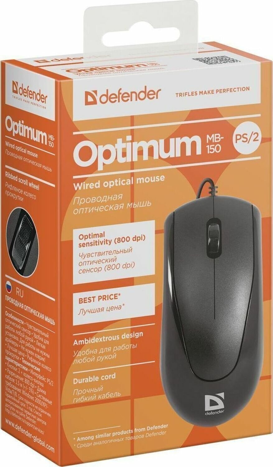 Мышь проводная Defender Optimum MB-150 / оптическая / 2 + колесо кнопка / 800 dpi / PS/2 / каб - 1,4м / чёрный. 52150