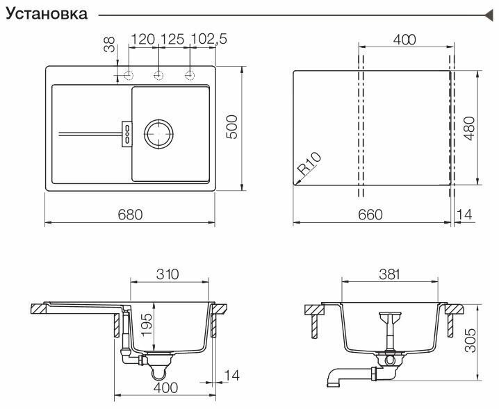 Врезная гранитная кухонная мойка 40 см, Horizont 40D Small Schock Шок