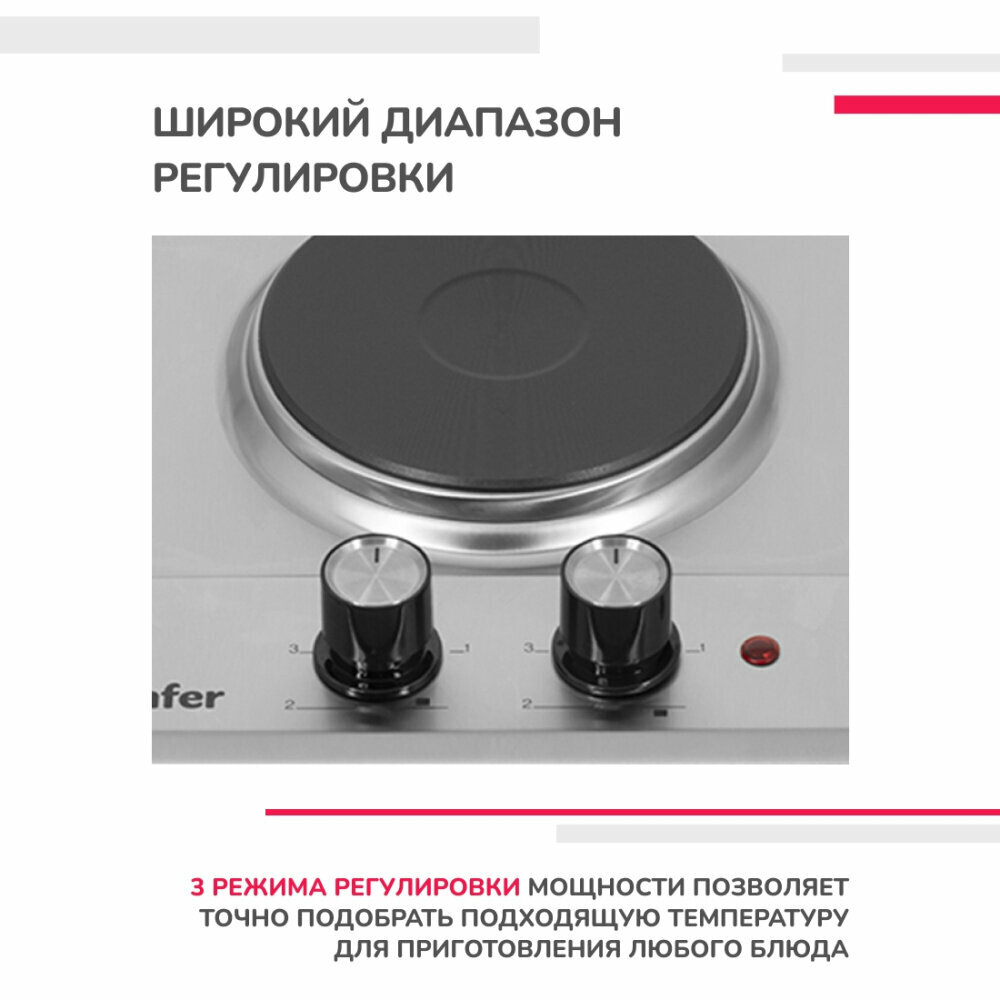 Мне нужна была компактная варочная панель для дачи и для дома на случай отключения газа. Приглянулась эта модель, стоит она недорого, надежная, удобная, с двумя мощными конфорками. Поверхность из нержавеющей стали, это практично, не будет сколов в процессе эксплуатации, как бывает на эмалевом покрытии. Конфорки нагреваются быстро, мощные, блюда быстро готовятся.